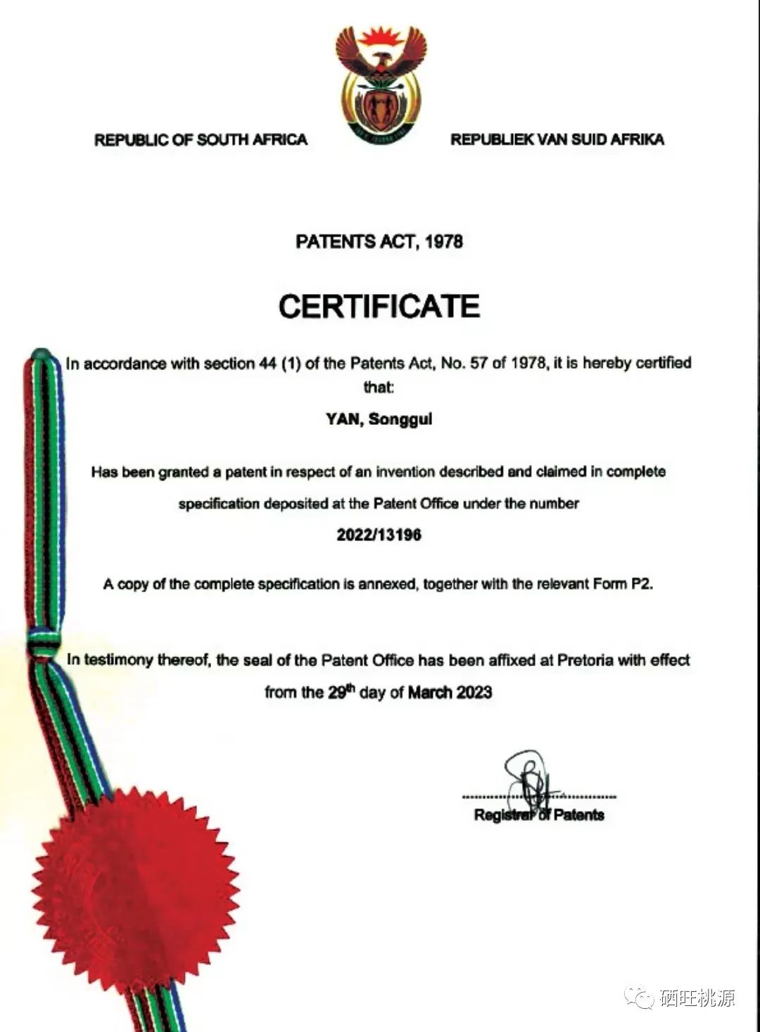 7月14日,从北京传来喜讯,桃源县富硒产品研究所申报的“一种多矿物质饲料添加剂和制备方法及应用”发明专利,被南非公司与知识产权注册局下发发明专利证书,于2023年3月29日授权,截止期限:2042年12月6日。专利号:2022/13196。